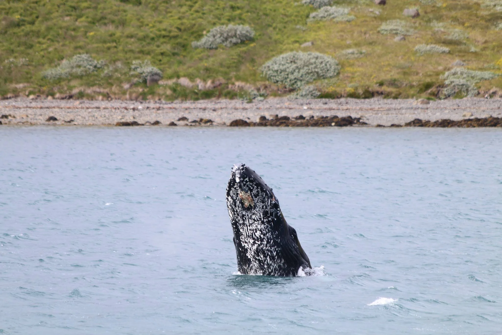 Good day in Eyjafiördur for whale watching. We have seen 3 species in today’s tours including harbour porpoises, minke whale and of course humpback whales. The minke whale was a bit elusive; the animal was travelling so we could see it for a couple of times before it went for a deep dive. The highlight of the day came with Black Arrow, a humpback whale that came half the way out of the water checking us out. In the afternoon we went all the way to the Hrísey the Island until we spotted a couple of humpback whales. One of them was Bad Fluker, it has been in the fjord since the beginning of May when we started the season, and so it was great to see this animal doing well. The other was a new individual now called Ziggi. They were both swimming together going into the fjord very calm. The afternoon tour was more active with 3 humpback whales next the herring factory. They were very synchronize when diving and breathing at the same time, it was great to see how social these animals can be. But the evening tour was the high point of the day. The humpback whale 50 shades was breaching for 20 minutes with some breaths in between and they it continued with fluke slapping against the water, what a wonderful display of acrobatics.