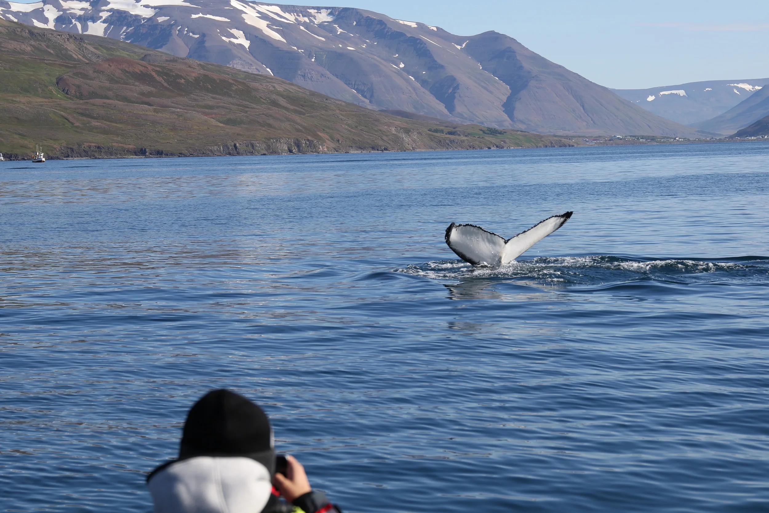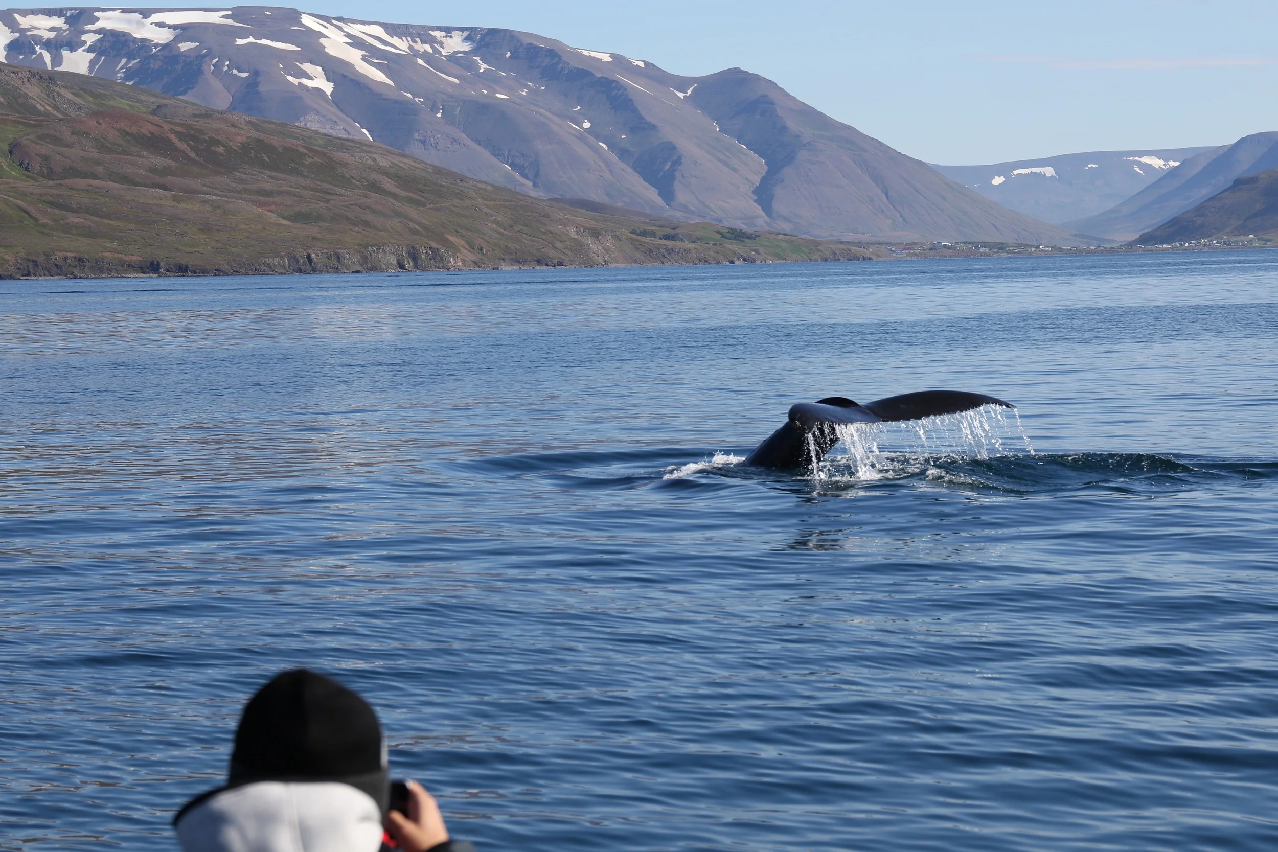 The fjord woke up with very cloudy surroundings but also very calm water. The sea conditions could have not been better!. After an hour of sailing we found our beloved humpback whales. We saw a couple of them on both trips on Hafsulan (our biggest boat in Akureyri). Both travelling together and doing some deep dives leaving the audience in awe. Something spectacular to witness indeed. They are new individuals to us. We haven´t got a name for them yet. I also don´t forget the close up look at the minke whale on the first tour!. Lovely and peaceful animal too. Also the rib boats got to see a few more individuals a bit further out. Some of those we know of. For example, Fjall (in the picture). The picture attached was taken by Atli Gunnarsson. One of our captains! good job! Amazing tours today!