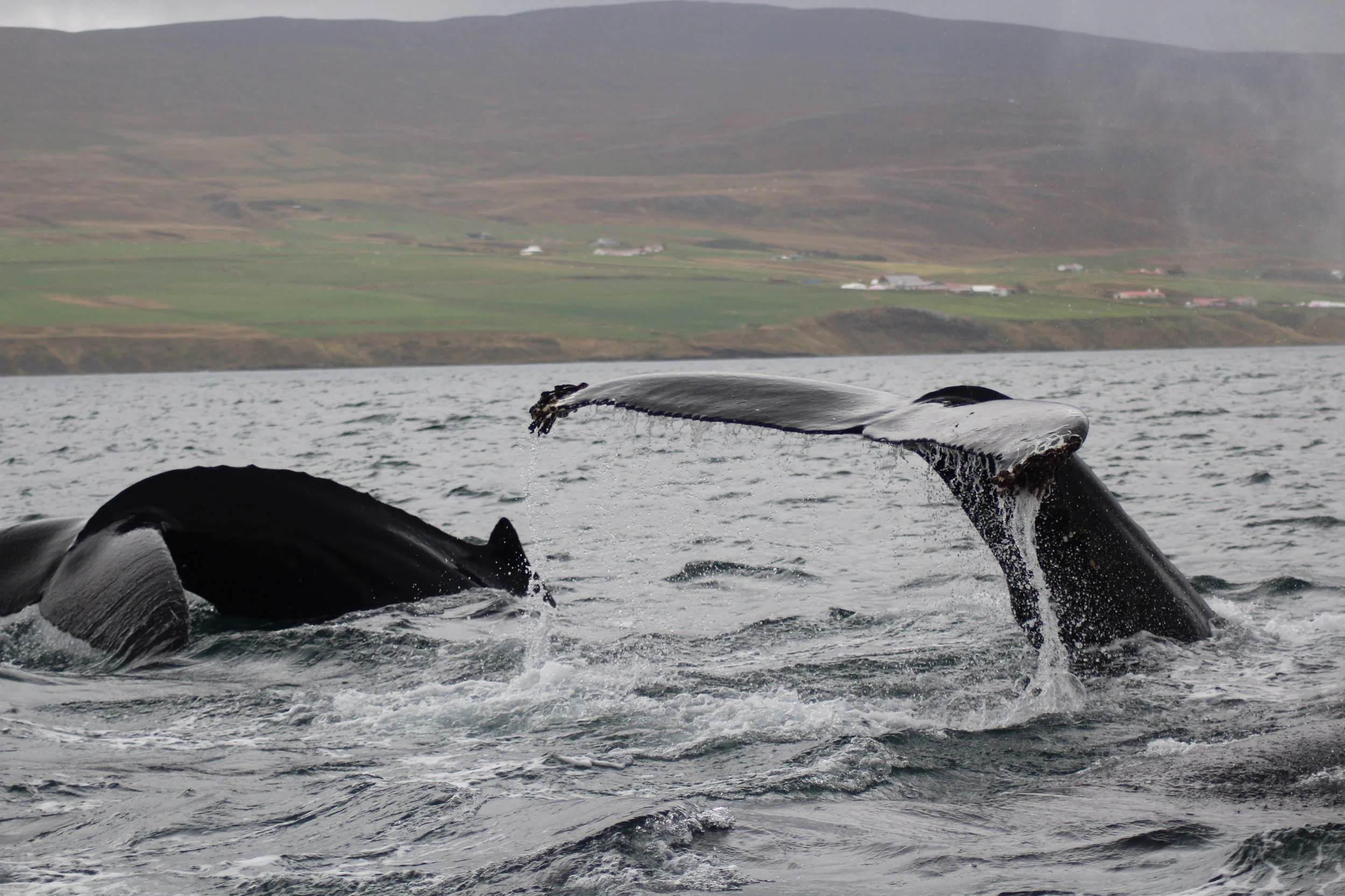 Today we had a lovely day with yesterday's six humpback whales. The weather was not the best with constant rain and a thick cloud coverage. Nevertheless we went out on two Rib boat tours and could enjoy the humpbacks for the whole day long. We met Dark Knight, King Louis, Aramis, Porthos, Athos and D'Artagnan very closely and could enjoy their stunning presence. Interestingly they had split in a pair and a group of four individuals. When we took a closer look at the pictures after our tours, we just realized that we had witnessed some history here. Our four musketeers from previous days had split up and now we had Porthos, Athos, King Louis and Dark Knight travelling together. How interesting to observe that kind of social interaction over multiple days. Hopefully these awesome six whales will stay in our beautiful Eyjafjördur for a little while longer. What a great day when whales can capture you in a way that you forget the rain pouring down on you and only concentrate on the animals and the nature surrounding you.