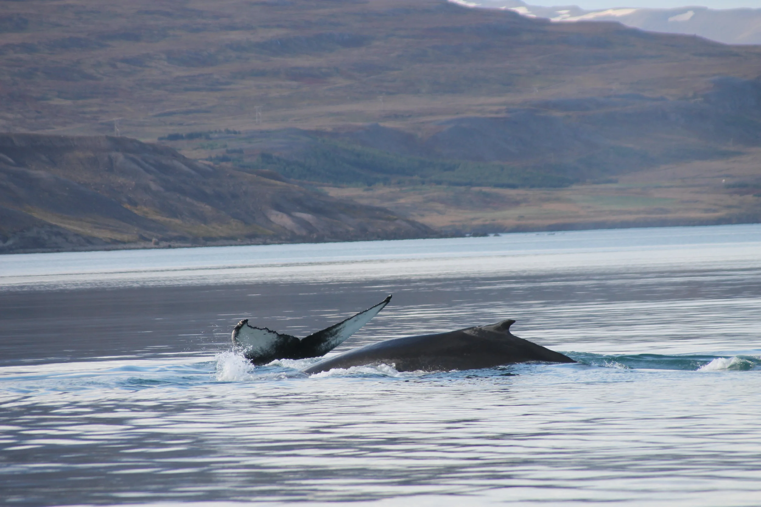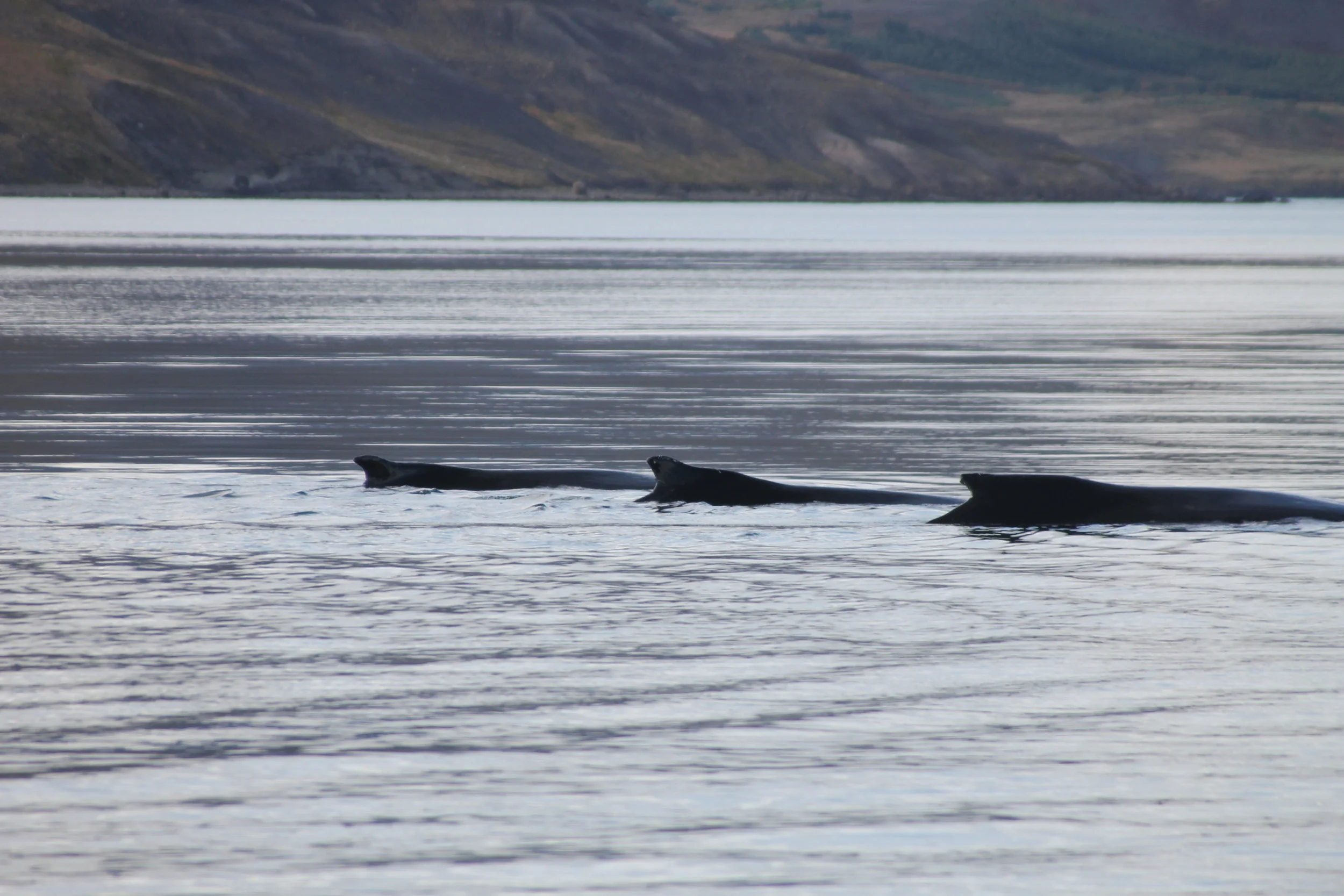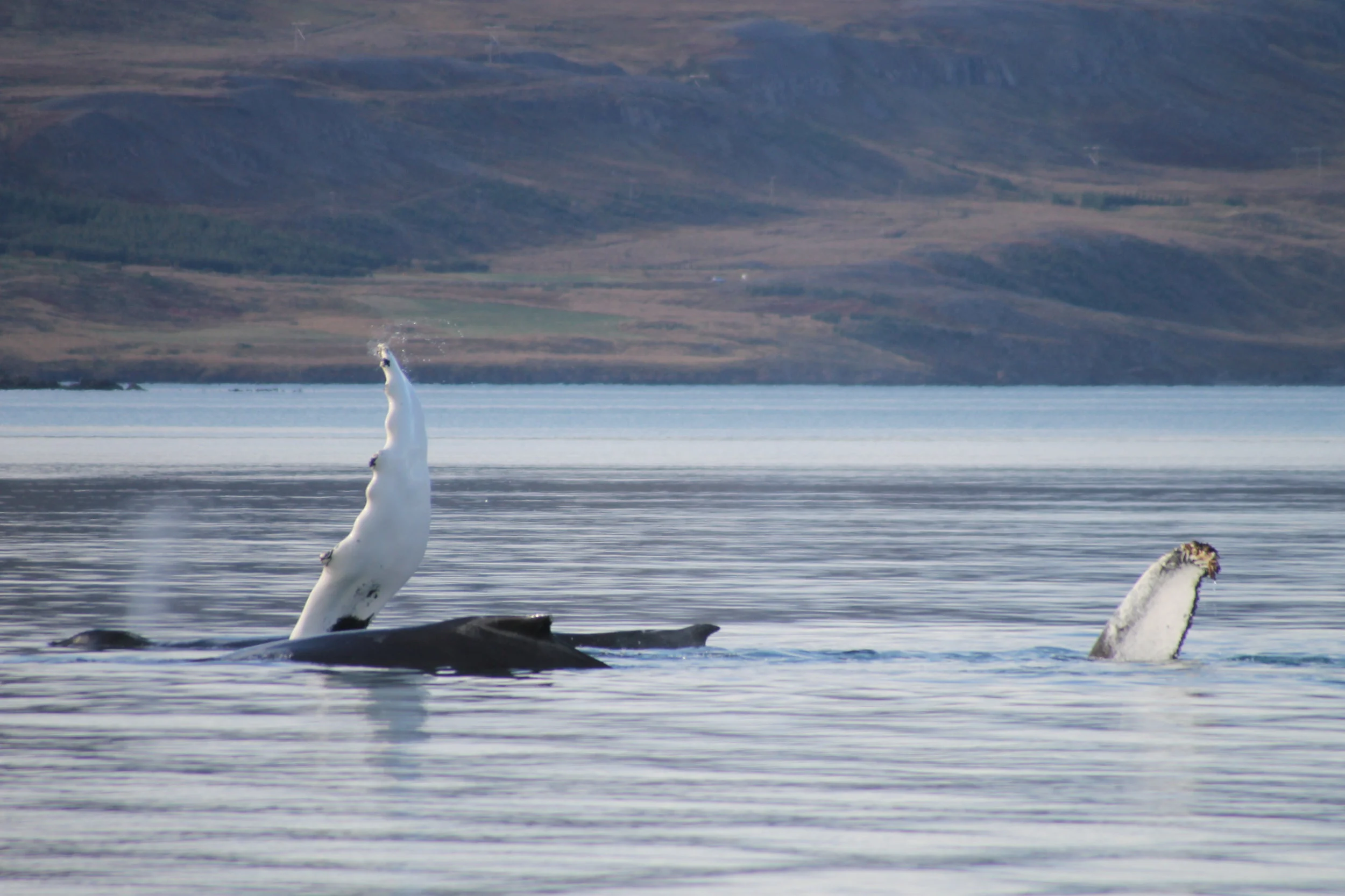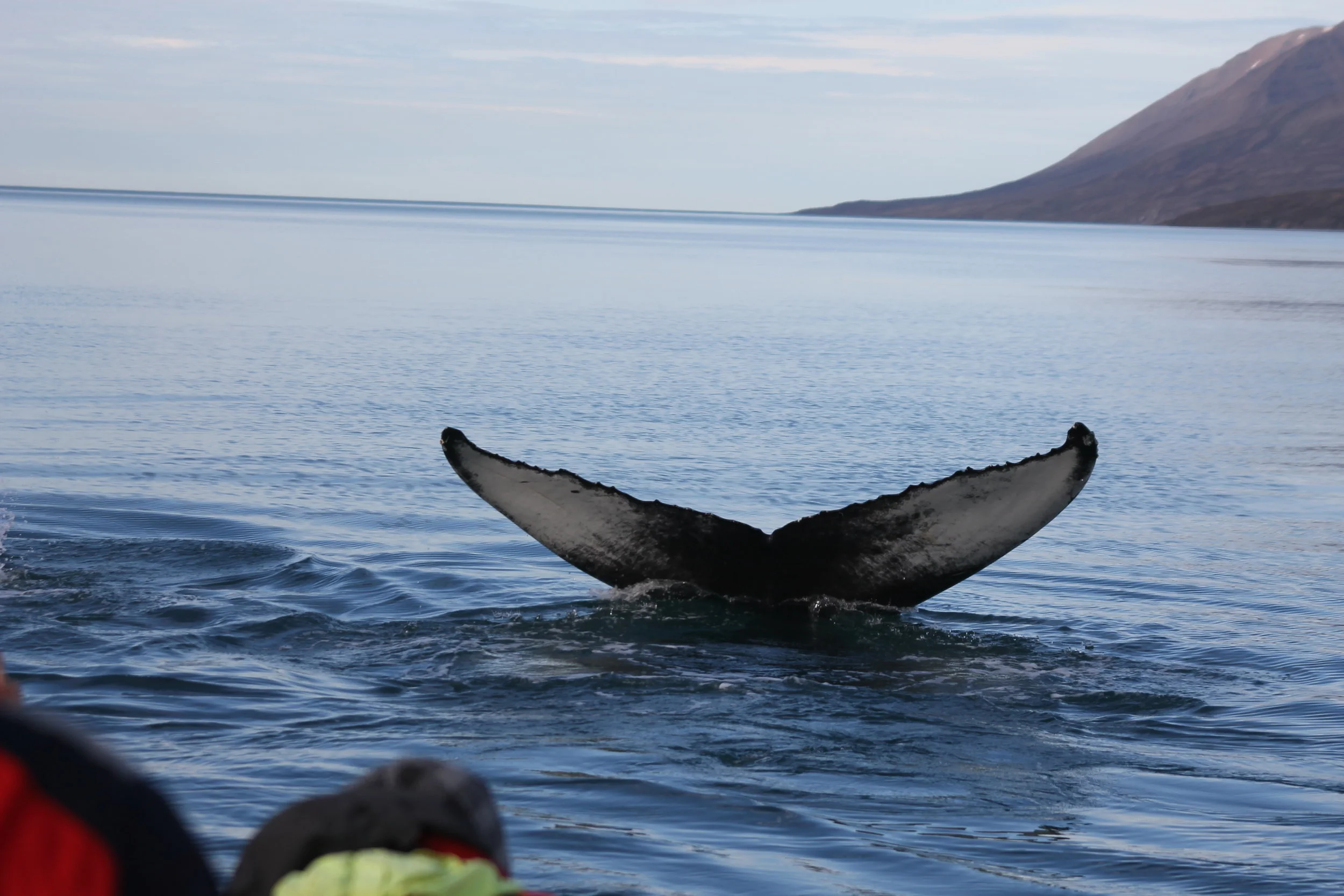 Today was brilliantly sunny and nice and warm and perfectly flat as we sailed out into the fjord. Some Whooper swans joined us on our sail out, flying far above us in formation. We didn't have to wait very long before we caught sight of the wonderful large blow of the humpback whale. On all of our tours today we experienced amazingly close encounters with these fantastic animals when they came up only a few meters away. At one point three whales suddenly surfaced just behind the boat almost giving our rib boat captain a heart attack! Five whales also surface all together nice and close to our large boat Hafsulan. At one point a whale surfacing in a group of four also decided to roll over and give us a wave! We were able to recognise many different individuals today including: Fjall, Dark Knight, Bear, Interstellar & some new ones. What a truly brilliant day to be out on the fjord.