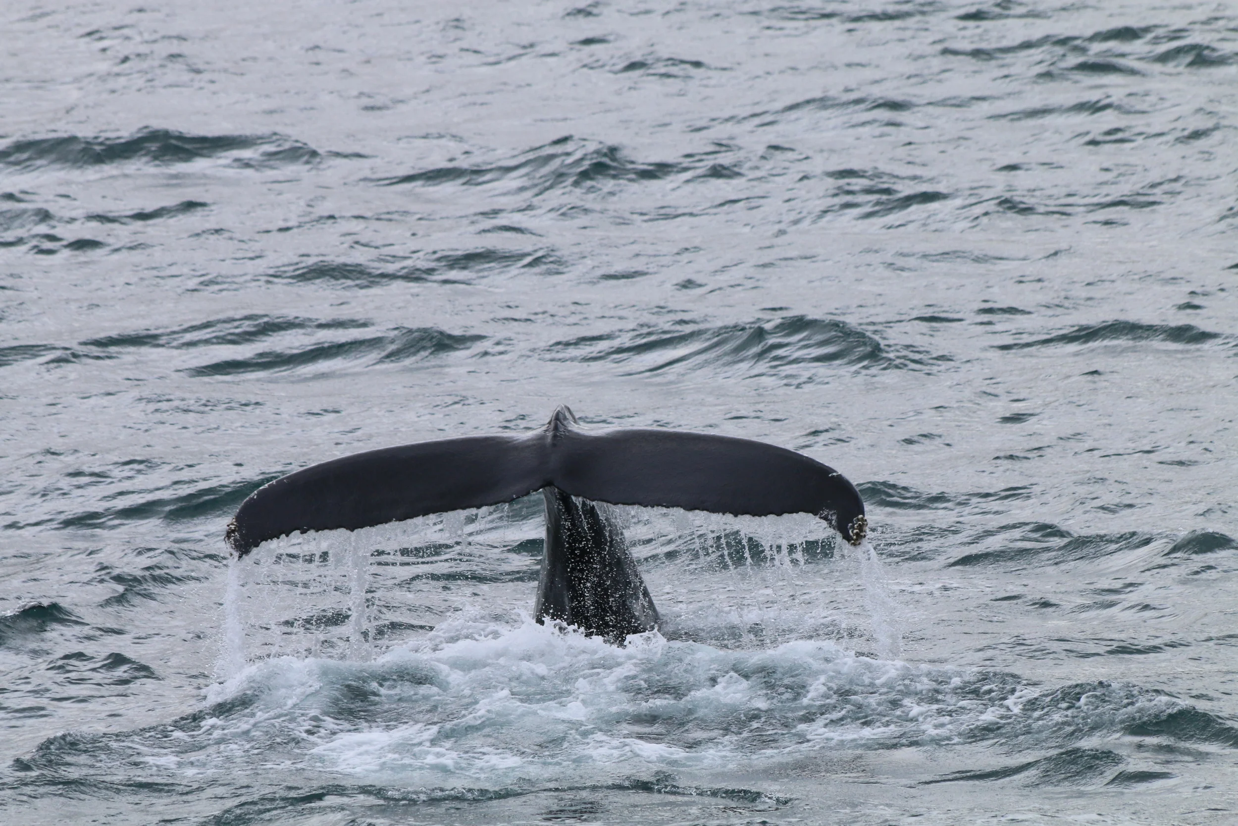 Despite a strong southerly wind this morning the weather conditions improved throughout the day with glorious sunshine on the last tour. Or most beloved humpback whales were in the Eyjafjordur in full glory today! We got regular close ups of Guillemot, who seems to be getting more curious every day, as well as Nonni, Van Gogh and Perlan who hadn't been seen in the fjord for the last week. The passengers had a fantastic day out on the water, let us hope the lovely weather and humpbacks are here to stay.