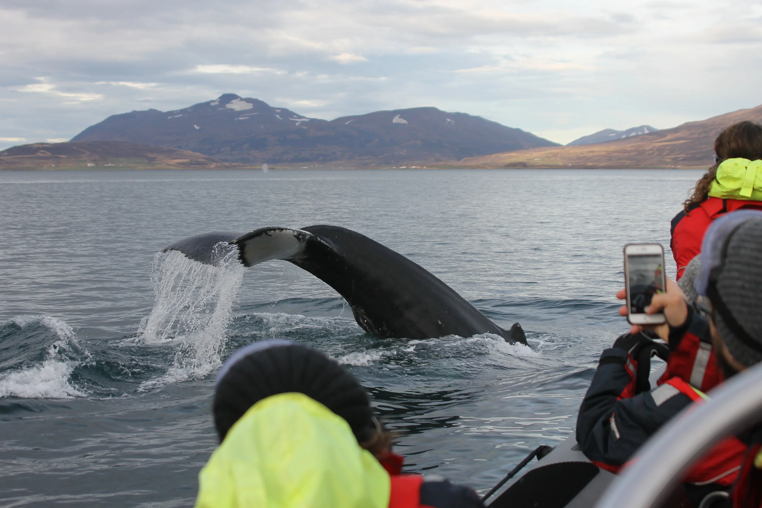 It was nice a warm as we sailed out onto the fjord, the sea was calm and fairly flat and we had a few spots of blue up in the sky which made great spotting conditions. Only after 15 minutes of sailing our first species were spotted, the harbour porpoises gave us a lovely show, bringing up their tiny little backs and dorsal fins. While we were watching these amazing little animals a humpback whale surfaced only a hundred and fifty meters away! Once closer we were able to watch this animal surface multiple times before going for a deep dive raising its beautiful fluke as it did so. After a short wait, another two humpback whale were spotted, then another and another, all at varying distances. We were able to observe these animals moving from one to the other in slow predictable movements. After a while of watching these animals we headed out and viewed a further two humpback whales and a minke whale too! Some of our favorite whales were out on top form including; Needle, King Louis, Reykja, Marier, Frankenstein & Daggers. The last two of which came excitingly close, giving our passengers at the front quite a surprise.