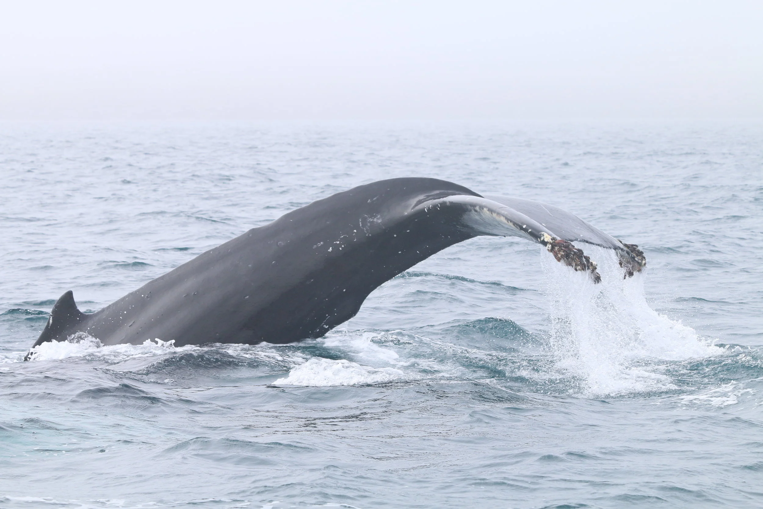 Eyjafjörður woke up this morning covered on fog. The sail out from Akureyri was an amazing adventure just being able to see 30 meters from the boat; however Össur, the captain, knows very well every corner of the fjord. It was a challenge to spot some animals for all of us; nevertheless the lack of wind gave us the opportunity to hear every single noise in the water. We saw some harbour porpoise swimming parallel to the boat for few seconds before they went for a longer dive. After a while 2 humpback whales came 50 meters far away from the boat like two shades from the deep blue. The beautiful noise from their breaths made it easier to follow the track of these guys in the middle of the fog. Later on we kept silence for a couple of minutes when we could hear the breath of another humpback whale, this time few hundreds of meter far away, we follow the noise until we could manage to see the fluke of the animal. In the afternoon the wind was picking up clearing up the fog from the fjord. We came across three humpback whales which were travelling together. They were coming up at the surface to breathe and going down for a dive at the same time. We have been seeing them together for several days now, more known to us as “Los tres amigos”. The evening was cloudy but the sun gave us heat in some parts of the fjord. We sailed around the island of Hrísey and we saw around eight different humpback whales. It was a wonderful day in the north of Iceland!