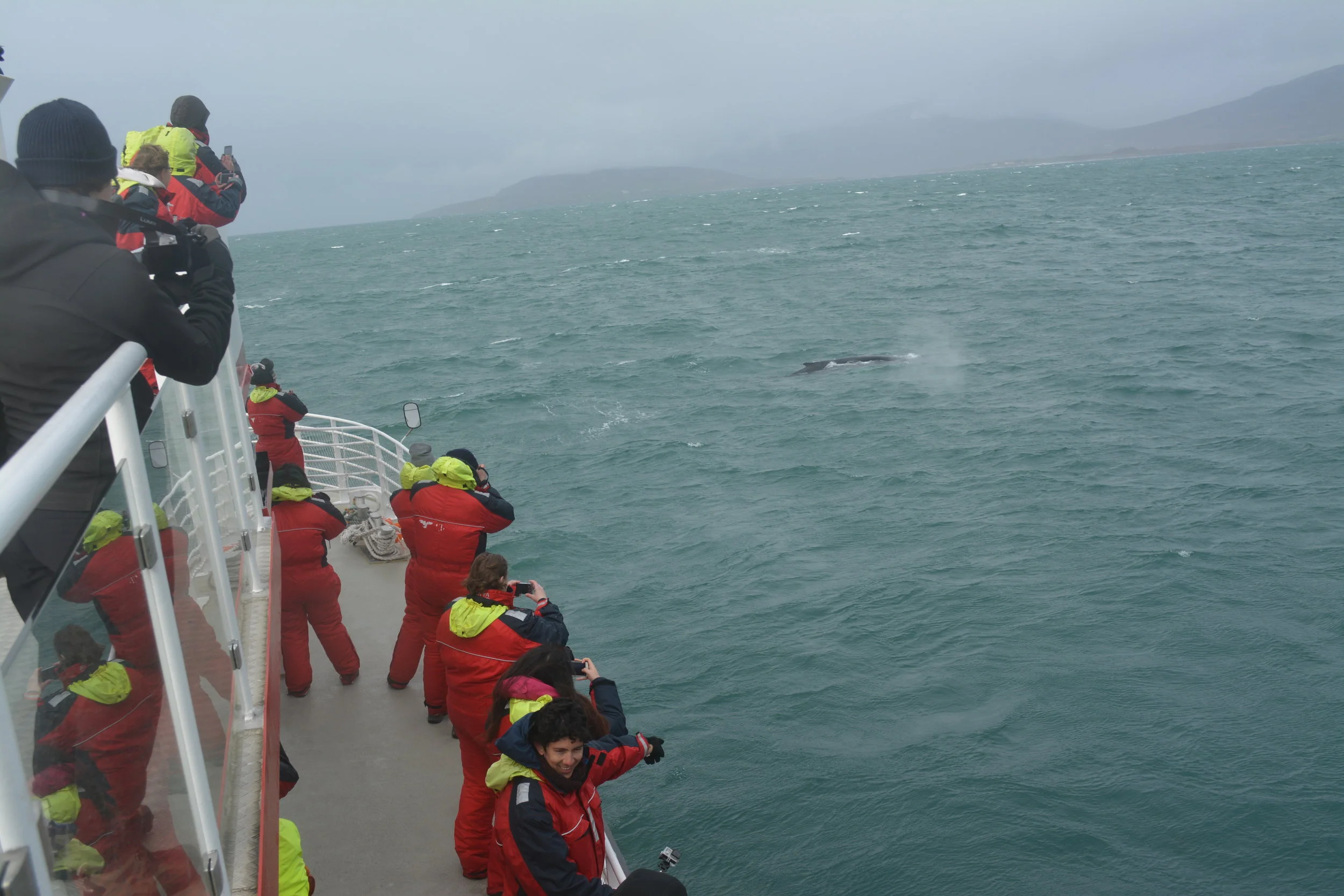Wind was hitting Akureyri from the north today, bringing the arctic cold with it, fortunately the overall work perfectly in this kind of days so we just needed a pair of gloves and a hat. The sea was carrying big swell and it was a bit rough, however we did enjoy sailing as authentic Vikings! We did have several encounters with humpback whales, in some of them the individuals came very close to the boat giving us a majestic show of their fluke before they went for a deeper dive. We could recognize “Fjall” and “Dark Knight”, two humpback whales that have been in the fjord for a while already.