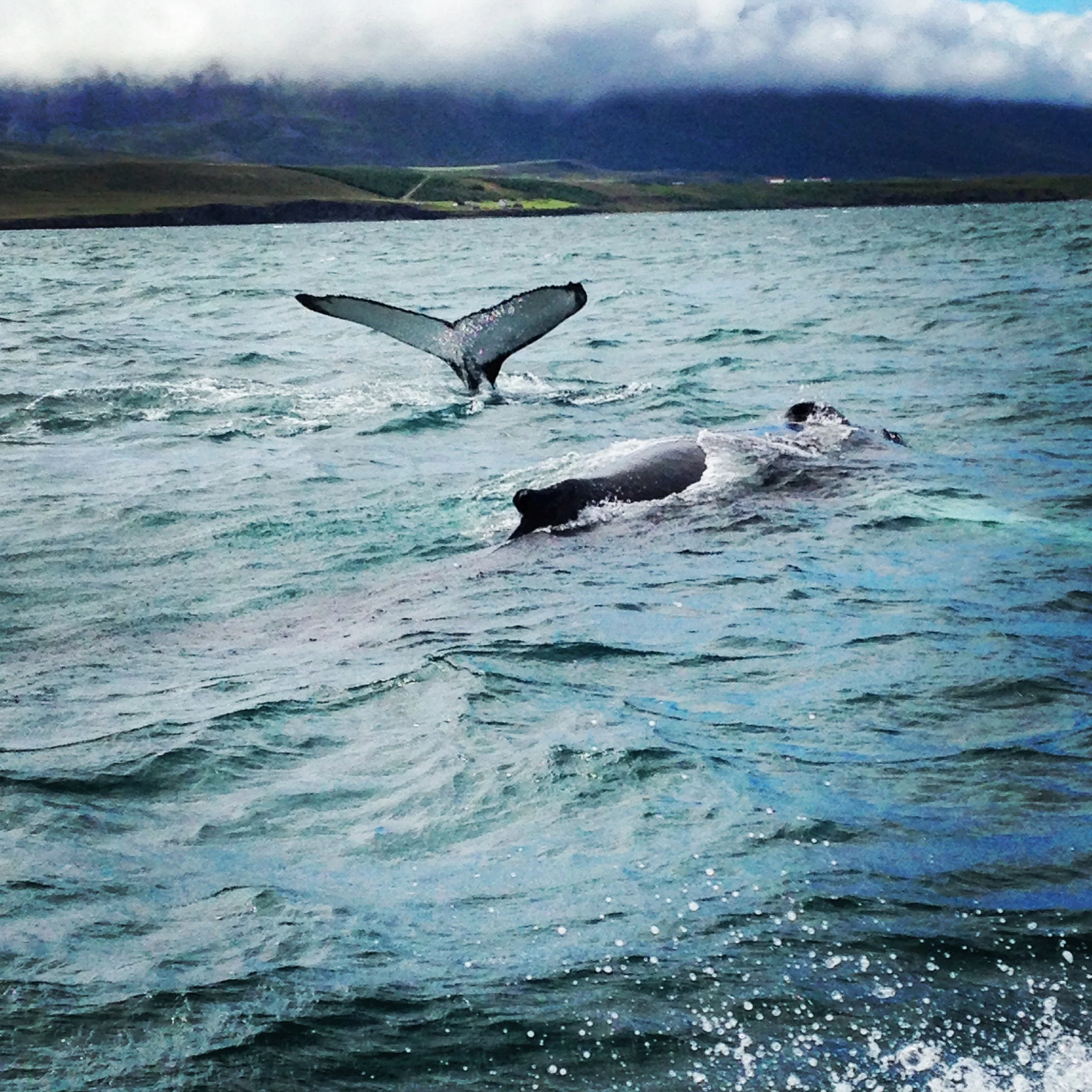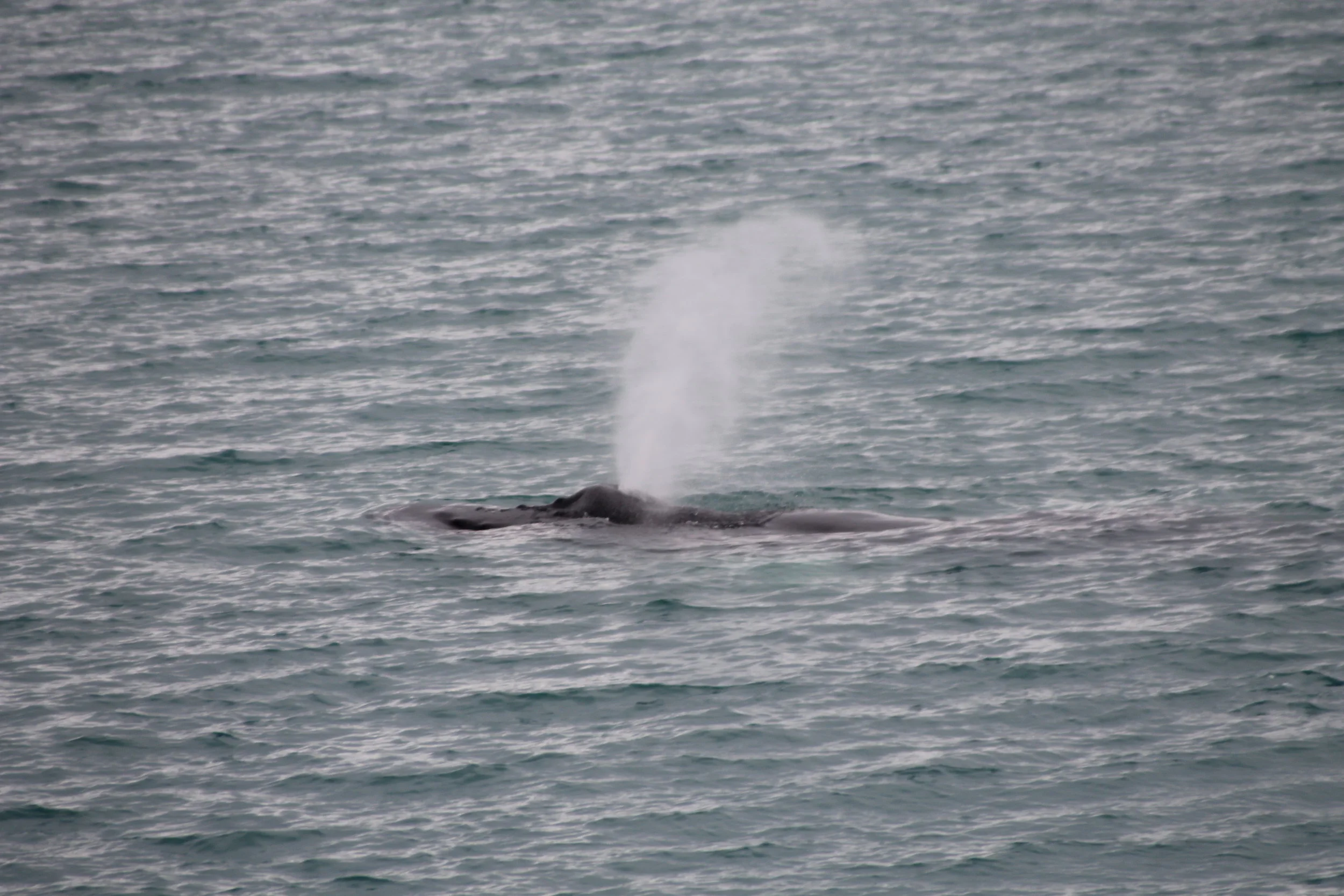 It was a wild and wet day out on the fjord. There was a fair bit of wind but it did not stop us from being out and spotting the whales. It didn't take us long for us to spot and find the whales today. We saw 3 humpback whales, two of our favourites Fjall and The Dark Knight and a new individual. We watched them surface beautifully close only a few meters from the boat. It was a bit rough out today but this just made the watching the whales all the more fantastic as they had to come up so high to breathe air free of flying water. These wonderful whales surfaced numerous times and occasionally went for a few long dives raising there majestic flukes as they did so.