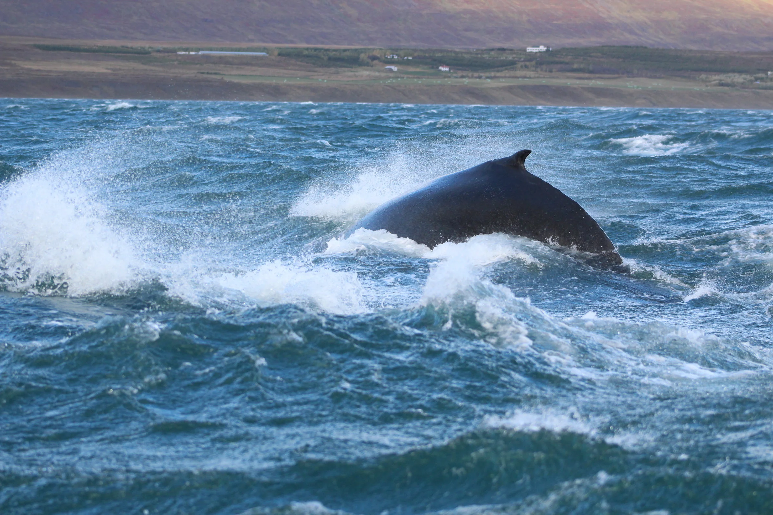 Only one word can describe our only tour of the day: epic ! Despite a pessimistic weather forecast, we decided to try our luck in the fjord as the sea conditions were looking quite good. We jumped in our RIB boat and took our passengers to the East side of Hjalteyri where we have been seeing our dear humpbacks lately. Suddenly the sea seemed to wake up, and it was in a bad mood. We were soon surrounded by tall waves, forcing us to slow down. Despite the talented sailing of our captain, on several occasion our boat dove into the waves, soaking us wet ! This brutal blessing from the North Atlantic Ocean did not make our passenger falter, we clenched our fist and made it to the whales anyway. There we found again the Four Musketeers, this group of 4 humpbacks sticking together. We got exciting close encounters with them, and every sighting was made more dramatic with all the water splashes from the waves and the wind flying around us. At some point we estimated that everybody was shaken and drenched enough, so it was out of question to do the way back by boat and we took everybody on land in Hjalteyri. In a nice bonus of wildlife, we could quickly befriend some chickens that greeted us on the dock. After few minutes of waiting and drying, cars came to pick us up and drove back to Akureyri. What a ride ! It was a rough but pretty exciting tour, clealry Viking material !