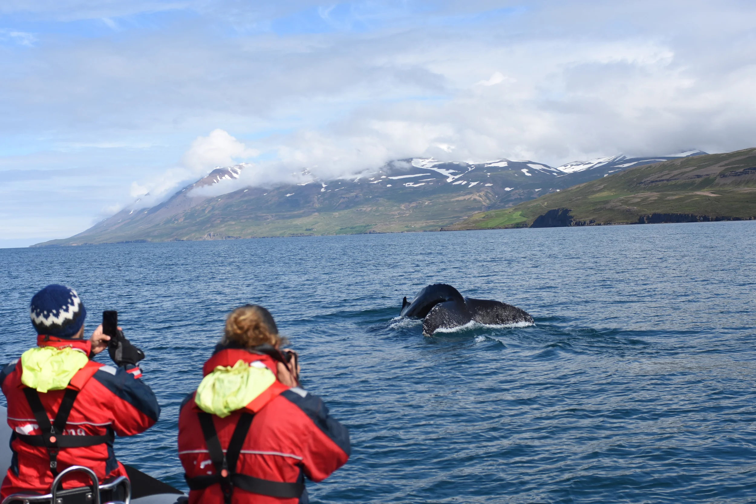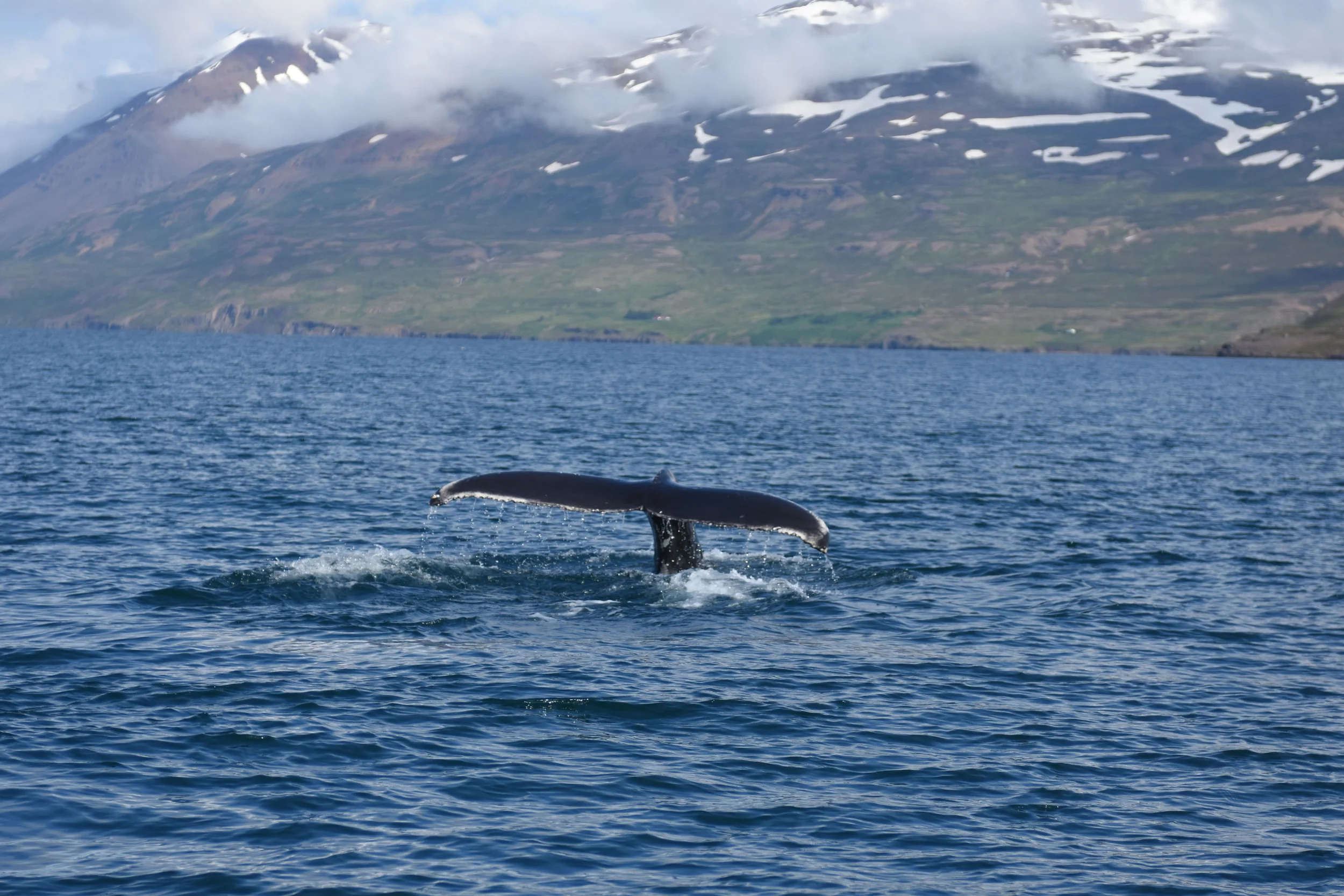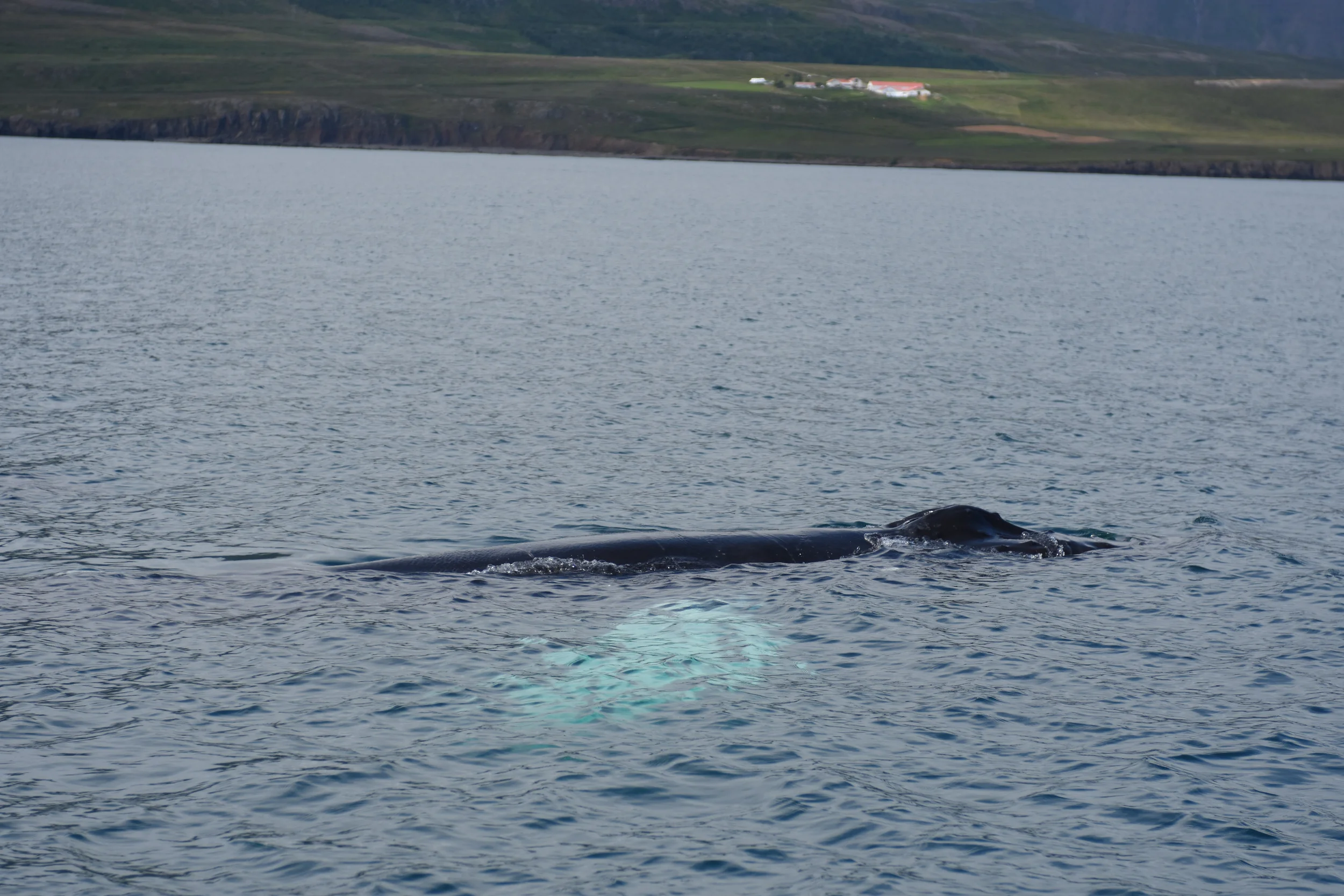 We woke up this morning with no wind and thus a mirror calm sea. It was beautiful to be out on the water this morning. The wind picked up a little in the afternoon but it was still rather calm. The majority of the whales were north of Hjalteyri today so we needed to travel for about an hour on the classic tour and maybe 30 minutes on the RIB. We saw a few of the regular Eyjafjord humpbacks today including '50 shades of Black, Ziggy and Tequila Blanca. Always nice to see the regulars.
