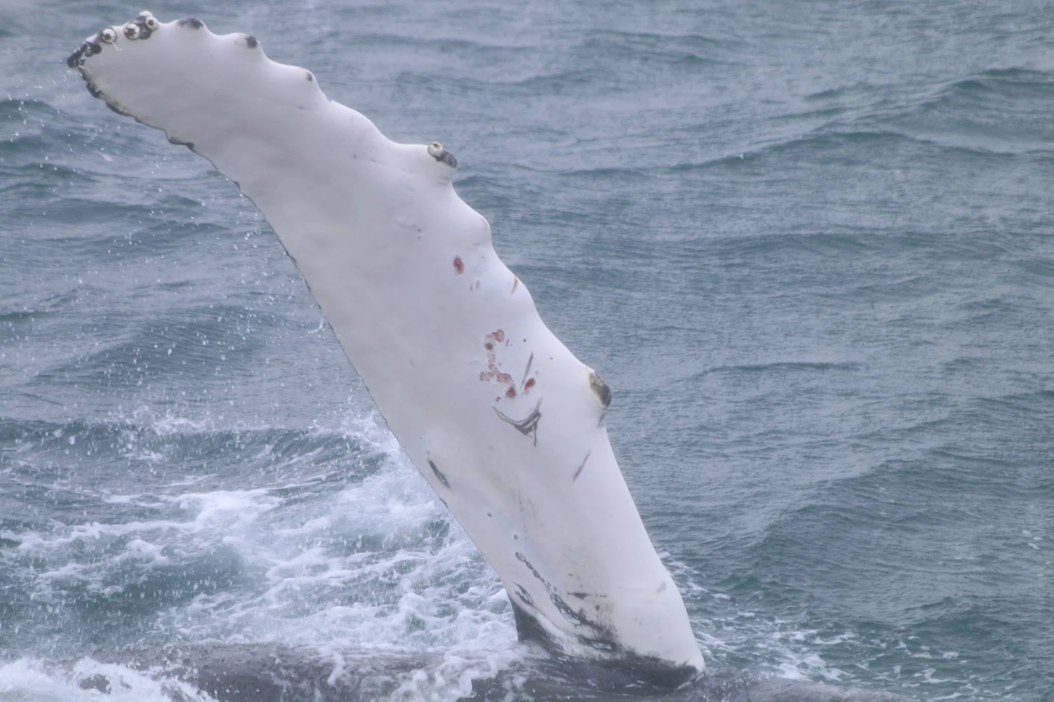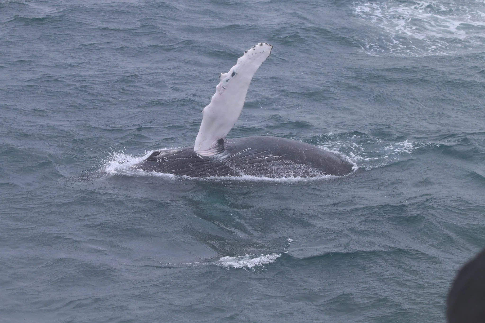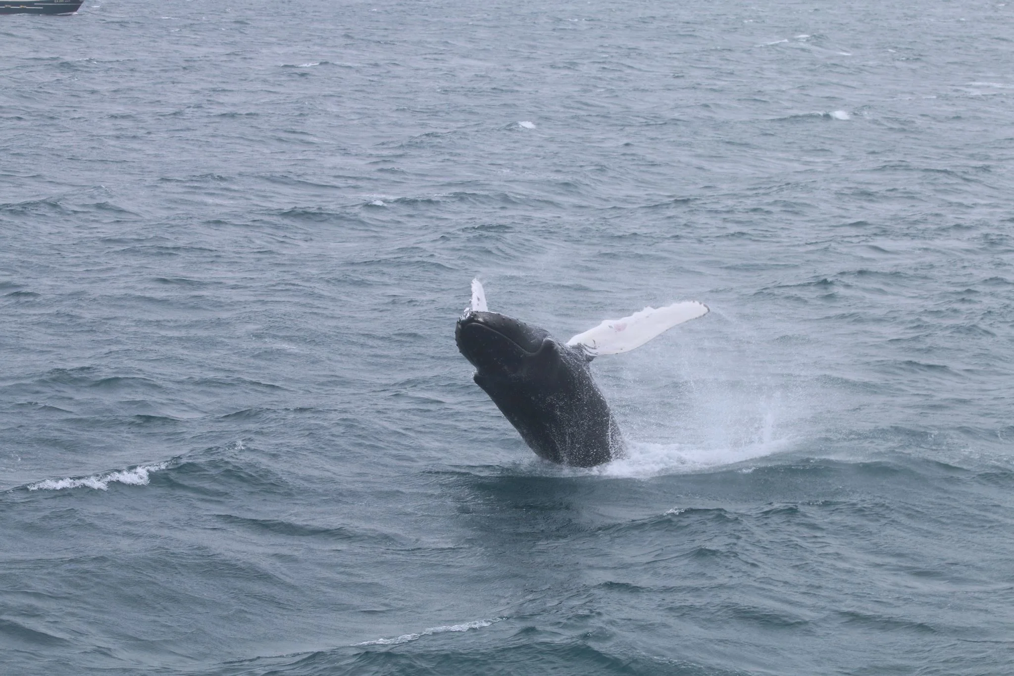 Waking up in Eyjafjördur with some clouds on the sky and the wind picking up. Some waves made the sail out of the fjord an adventure in the morning, but it was completely worth it once we had one of the best encounters with a humpback whale. Literally the animal was breaching for over an hour!! What a beautiful display Tequila Blanca showed today. Together with the breaches it did some flipper slapping too. At the same we could see several humpback whale blows. The wind gave us a break and we could sail easily through the afternoon and evening. Another humpback whale was breaching 12 times in a raw in the afternoon tour. Some other animals were feeding in the area coming up to breath and showing beautiful flukes. Definitely a special day in the capital of the north. Looking forward to go tomorrow and see more of these wonderful animals, you are more than welcome to join us!