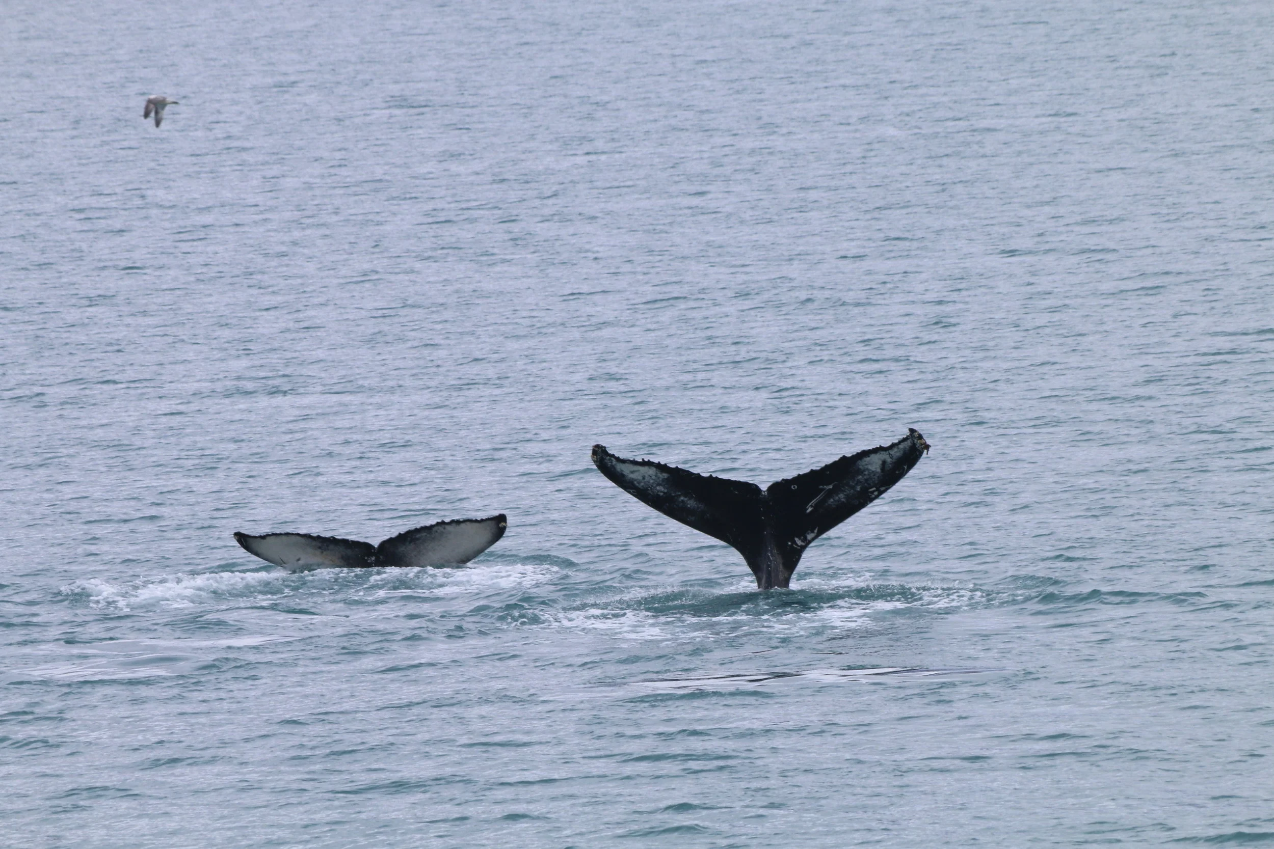 Flat sea in Eyjafjörður today with just a fresh breeze which remained us that we are still in the north of Iceland. The reflection of the clouds in the water surface made very easy to spot the humpback whales, even from the distance. We sailed after Hjalteyri where we were basically waiting for the animals to come up at the surface to breath. We barely had to move the boat to approach the animals; in fact the whales were the ones coming closer to us. Great closer look to the flukes before going for a dive and to the blowholes while breathing from these amazing animals that always make our days.