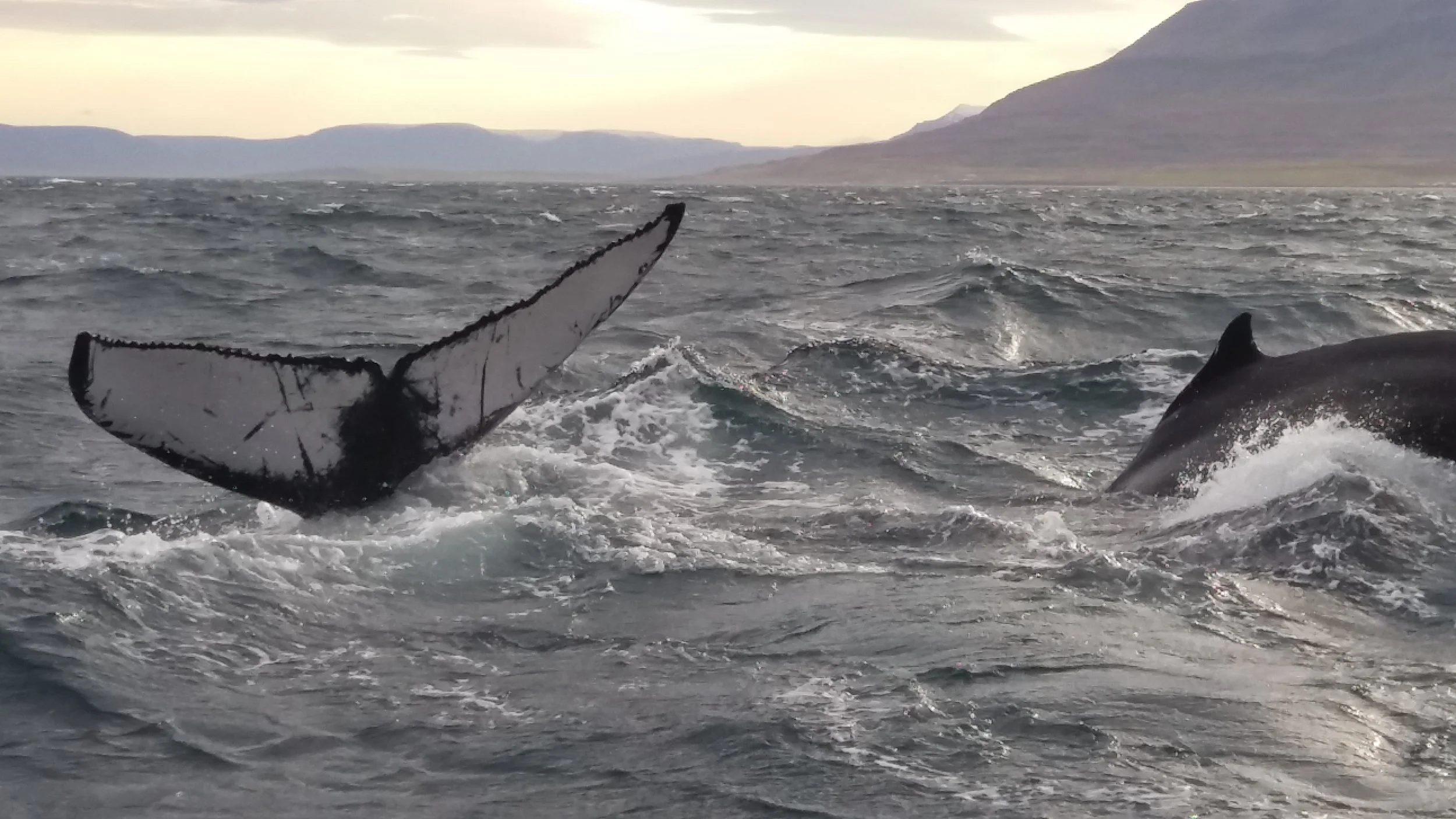 Today has been the day of changing winds here in the fjord. While it was considerably calm around Akureyri, the wind increased quite a bit the further we went out. We had decided to go closer to the island of Hrisey because we had heard that a lot of humpback whales were in the area. And it turned out to be true, first we encountered a group of 3 humpbacks before we saw at least the blows of 5 more individuals. However the swells had increased a lot so that we decided to stay with the group of 3. It was really nice to see even the humpbacks surfing the waves and coming up high out of the water in order to take a deep breath. That's when we realized that one of them was our mate Millennium Falcon, how great to see it again. When we returend we were sailing against the wind so that we moved in zigzags around the fjord to make the sailing more comfortable. Luckily we did because we found 4 more humpbacks on our way back, one of them was Frankenstein. A bit of a windy but still nice afternoon in Eyjafjördur.