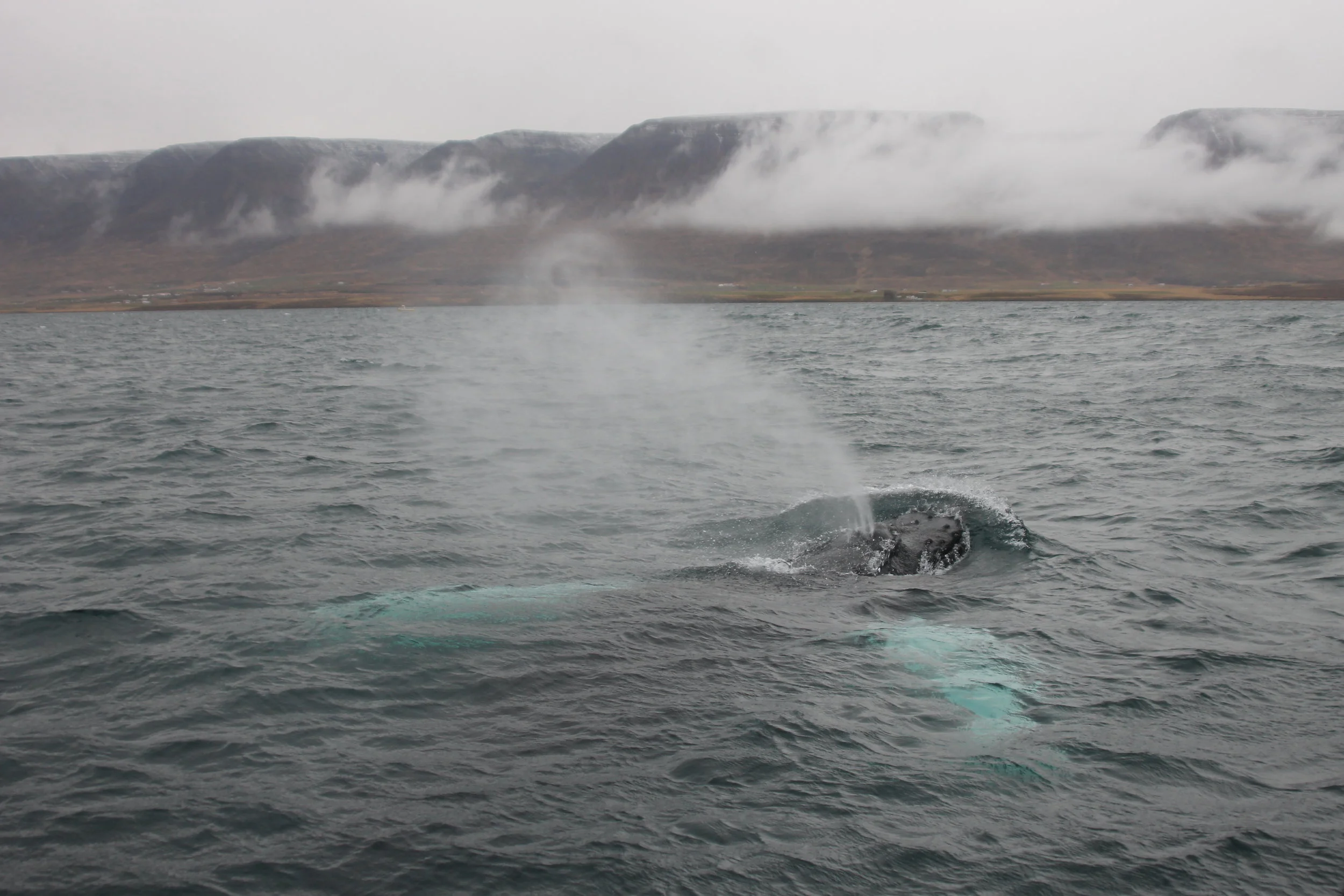 What a spectacular day to be out on the fjord, the sea was fairly calm and it wasn't too chilly despite the beautiful snow on the mountains. After only a short sail the first blows were spotted in the near distance. Once closer we were able to watch this animal surface many times before it headed for a deeper dive. After a short journey across the fjord we were able to watch another two individuals surfacing brilliantly close. These animals were taking rather long dives but another two animals were spotted in the distance which we were able to watch while we waited. As the wind began to pick up the whales had to come much higher out of the water to be clear of the surf to breathe, which gave us a fantastic view of their wonderfully large bodies.
